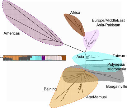 Global Population TreeNeighbor-joining F ST-based tree for the Pacific and HGDP-CEPH combined datasets (687 microsatellites). Superimposed colors are from the STRUCTURE analysis at K = 6 (also shown).